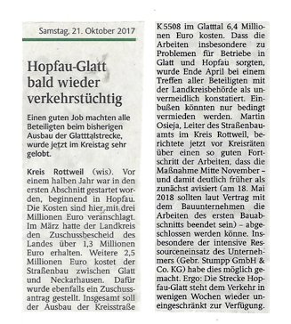 Die K5508 ist eine wichtige Verbindungsstraße zwischen Hopfau und Glatt (Schwarzwald-Deutschland) und kann nur schwer umfahren werden. Durch den Sanierungsbedarf musste die Straße gesperrt werden. Industrie und Hotelgewerbe sind abhängig von der Verbindungsstraße und fürchteten hohe Verluste. Durch den Einsatz der NovoCrete-Technologie konnte die Bauzeit um 6 Monate verkürzt werden, sodass die Anlieger wieder schnell die gewohnte Infrastruktur nutzen konnten.
